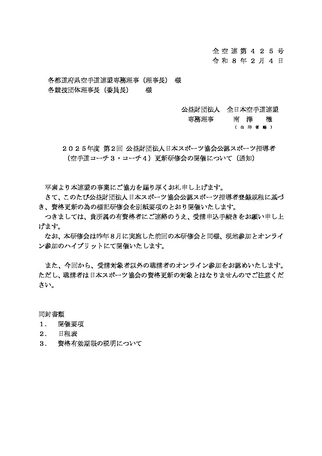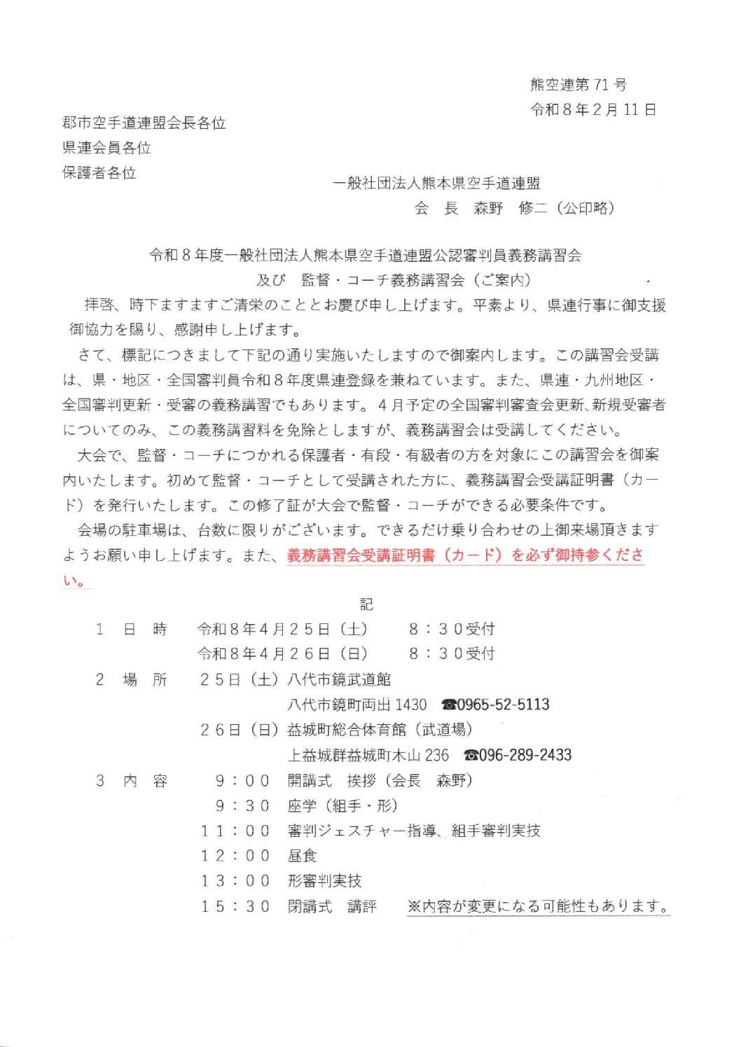 令和8年度全国組手審査会・講習会・選考会のお知らせ